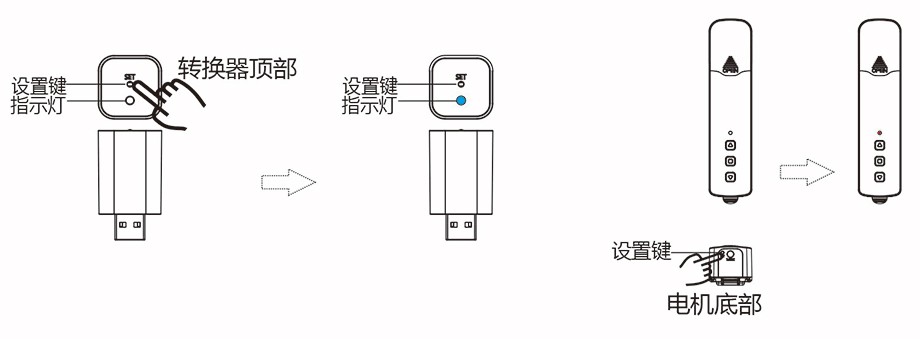 ◆點(diǎn)按轉(zhuǎn)換器【設(shè)置鍵】,當(dāng)轉(zhuǎn)換器【指示燈】藍(lán)色快閃后,連續(xù)點(diǎn)按電機(jī)【設(shè)置鍵】?jī)纱?,電機(jī)【指示燈】紅色慢閃;