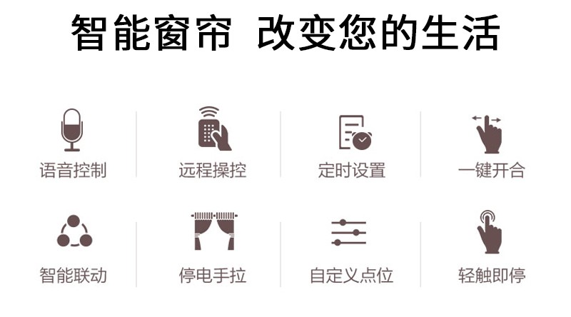 此產(chǎn)品適用于卷簾、柔紗簾、香格里拉簾,改變傳統(tǒng)窗簾手動拉升,調(diào)節(jié)遮光的方式,通過語音控制、手機APP控制、遙控控制等手段,讓您悅享智能生活帶來的便捷與樂趣!