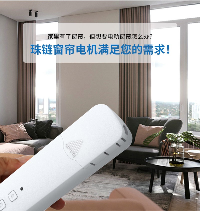 此產品適用于拉珠卷簾,可以把傳統(tǒng)的拉珠卷簾改變?yōu)橹悄茈妱哟昂煟惭b簡單,操作方便。安裝后可通過遙控器、語音、手機APP等控制窗簾升降。